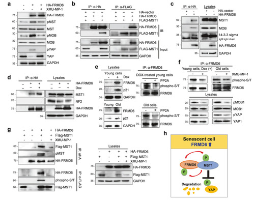 首先,作者证实FRMD6在MST激活中的作用。过表达FRMD6可以增加磷酸化MST的水平;XMU-MP-1可抑制MST的磷酸化和下游效应物MOB和YAP的表达。这表明MST位于FRMD6的下游。使用HA-FRMD6和FLAG-MST1质粒共转染IMR90细胞,结果显示FRMD6拉低MST1。当单独表达时,HA-FRMD6可以捕获MST1和MOB以及14-3-3 sigma。接下来作者在DOX诱导的衰老细胞中,检验FRMD6和MST之间的关系结果显示DOX可以增强FRMD6-MST1的相互作用。随后作者在DOX诱导的衰老细胞中检测到FRMD6水平升高;相反PP2A可抑制磷酸化FRMD6的表达水平。作者为了进一步确定,使用XMU-MP-1显著降低磷酸化的FRMD6水平。当共同表达时,FRMD6和MST1相互作用增强,但XMU-MP-1可以抑制他们的相互作用。总之,衰老细胞中FRMD6的上调可以促进其与MST的相互作用和MST的激活,激活的MST磷酸化FRMD6,最终导致YAP失活。