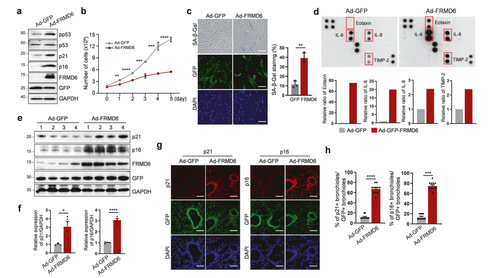 基于FRMD6在衰老中的潜在作用,作者研究过表达FRMD6是否会诱导IMR90成纤维细胞的衰老,结果显示p21,p16和磷酸化的p53水平升高。同时,过表达FRMD6细胞的增殖能力下降。此外,SA-β-Gal活性升高。这证实了FRMD6在衰老中的诱导作用。作者又检测衰老相关因子的分泌情况,发现Eotaxin、IL-6、IL-8和TIMP-2水平升高。总的来说,这些发现支持FRMD6在IMR90成纤维细胞诱导衰老的作用。作者又进一步研究FRMD6在肺中的作用。结果显示过表达FRMD6 p21和p16显著上调。同时,免疫荧光染色显示过表达FRMD6肺切片中p21和p16的表达升高。
