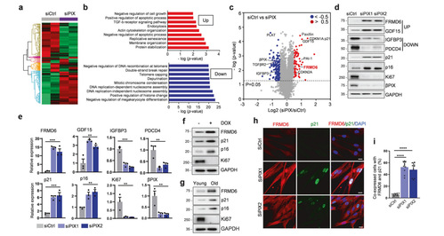 βPIX可以引发细胞的衰老。为此,我们通过蛋白质组学分析,发现4643例差异表达的蛋白。其中,我们重点研究FRMD6,首先检测到其在衰老细胞中的表达升高。在DOX诱导的衰老细胞中同样检测到FRMD6表达升高,最后作者通过免疫荧光染色,在衰老细胞中检测到FRMD6与P21的共定位增加。