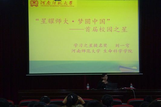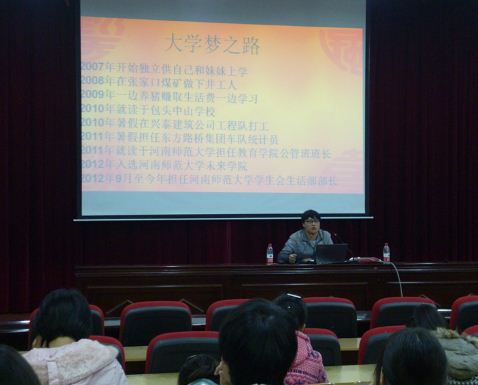 此次活动由我校首届“校园之星”评选活动中的“学习之星”提名奖获得者刘一穹、“励志之星”提名奖获得者王亚清担任主讲人。首先,刘一穹同学借助视频资料向大家介绍了自己的“学霸生活”,通过“师大的三堂课”讲述了自己对课堂学习、校园活动、理念培植的成长感悟,并提出“优秀是一种习惯”的观点,使同学们获益匪浅。接着,“励志之星”提名奖获得者王亚清向同学们讲述了自己独自带着妹妹上学的艰苦求学之路,他通过自己在工地、矿井、废品回收站等地勤工俭学的经历以及为山西农业大学患病学生募捐的事迹鼓励在场同学树立积极乐观的心态,理性坦然地面对生活。王亚清同学自强不息、艰苦拼搏的事迹感人肺腑,不少同学听之潸然泪下。最后,活动在热烈的掌声中圆满落幕。