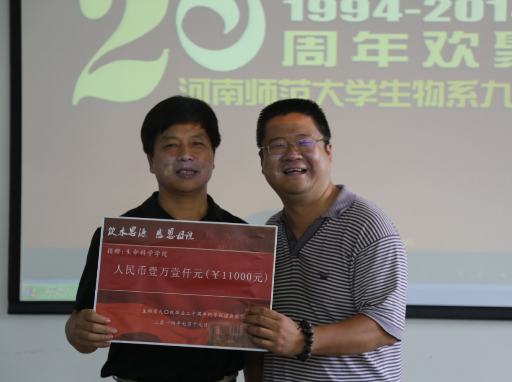 为表达对母校、母院的崇敬之情和诚挚谢意,校友杜同彦代表校友向学院赠送了富有地方特色的手工艺品——麦杆画;校友秦景厂代表校友向学院赠送了人造水晶画,热切希望生科院“马到成功,再创辉煌”;焦作沁阳的94届校友向学院赠送了书法作品,表示94届校友愿和母院“携手奋进,共创明天”;校友张磊代表94届校友向母校、母院捐赠了总额11000元的教育助学基金,成为生命科学学院校友“饮水思源、感恩母院”的第一份爱心助学基金,旨在奖励生命科学学院品学兼优的在校大学生,激励生科院学子薪火相传、感恩自强。