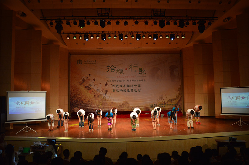 四载经年弹指一挥,离歌响起送君远行。6月7日晚,生命科学学院“拾穗 行歌”2011级本科生毕业晚会在帕瓦罗蒂音乐厅举办,校党委办公室副主任段红伟,文学院党委副书记孙冬青,生命科学学院党委书记段建章,院长李春喜,党委副书记马新峰,副院长常重杰、李景原、李卫国、李建军,生命科学学院及兄弟学院教师代表与我院学生六百余人共同观看了此次晚会。