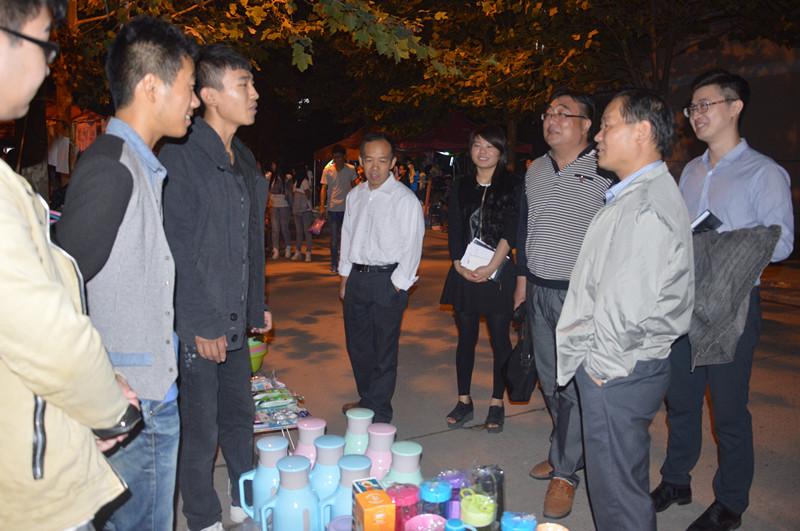 学院领导老师一行来到学院学生勤工助学摊点,检查销售商品质量,了解商品销售情况,鼓励同学们通过勤工俭学自强不息的行为。随后,领导老师一行又来到学院迎新点,询问新生到校情况,嘱咐迎新志愿者在迎新工作中要细心认真,并叮嘱同学们夜间气温低,要注意保暖。
