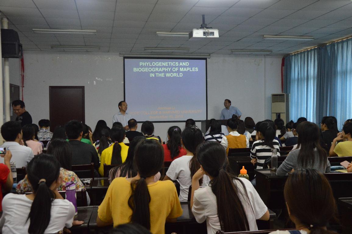 9月10日上午,我校杰出校友,美国密歇根州霍普学院教授、博士生导师李建华应生命科学学院邀请,在生物西楼206会议室做了一场主题为“Maples phylogenetic sand biogeography”的学术报告。生命科学学院王海磊教授,马剑敏教授,王太霞教授,李明军教授,邓传良副教授等带领百余名本科生共同聆听了此次报告会。会议由学院副院长李景原主持。
