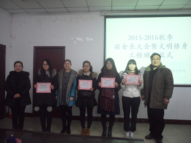 12月24日中午,我院在生物西楼206会议室举办大学生文明修身工程颁奖大会。院党委副书记马新峰、党委秘书兼2015级辅导员韩婧、团委书记兼2012级辅导员王芳及部分学生会干部带领2015级全体宿舍长参加此次大会。