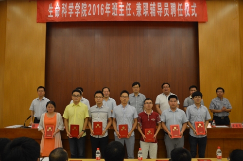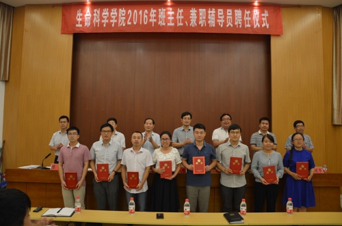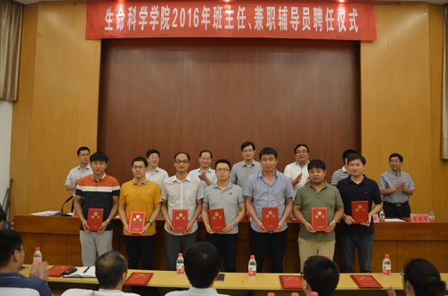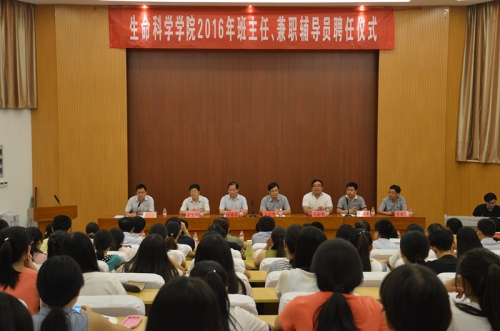 9月7日晚上8点,生命科学学院在生物报告厅举办2016年班主任、兼职辅导员聘任仪式。校党委学工部部长、学生处处长王宏伟,校党委学工部副部长、学生处副处长康海军,院党政领导马新峰、李春喜、陈勇、李卫国、李建军出席聘任仪式。受聘的班主任和兼职辅导员,专职辅导员以及2014级、2015级学生代表参与仪式。仪式由院党委副书记陈勇主持。
