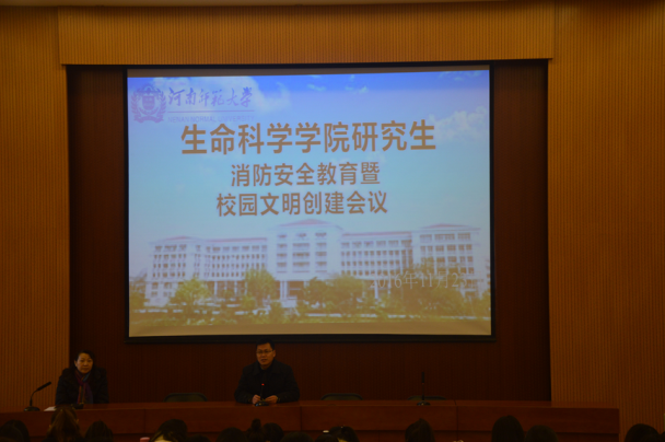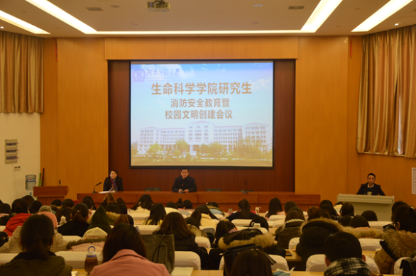 11月23日上午,生命科学学院研究生消防安全教育暨校园文明创建会议在生物报告厅召开了,生命科学学院党委副书记陈勇、研究生辅导员靳同霞以及300余名在校研究生参加了本次会议。本次会议由研究生辅导员靳同霞主持。