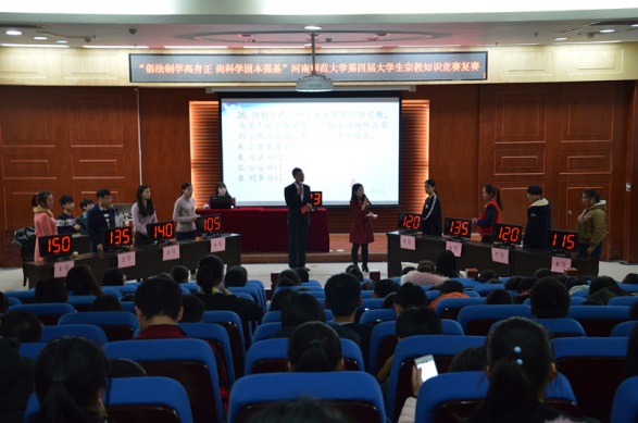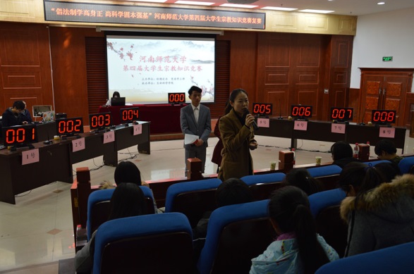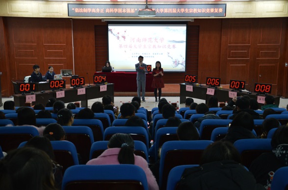 为普及宗教知识,宣传国家有关法律法规,在广大大学生中形成“学习宗教、认识宗教、抵制邪教、崇尚科学”的良好氛围, 11月26日,由河南师范大学校稳定办、党委学工部主办,生命科学学院承办的“倡法制学高身正 尚科学固本强基”大学生宗教知识竞赛复赛在东区模拟法庭举行。校稳定办主任秦法跃,党委学工部副部长、学生处副处长康海军,党委学工部、学生处思教科科长张永富,文学院党委副书记高飞,教育与教师发展学院党委副书记康淑霞,生命科学学院党委书记马新峰,生命科学学院团委书记兼2016级辅导员王芳带领百余名学生观看比赛。