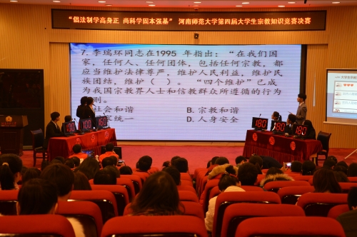 12月4日上午,我校第四届大学生宗教知识竞赛决赛在校思想政治理论课实践教学平台举办。省教育厅思政处副处长方治强,校党委学工部部长、学生处处长王宏伟,党委办公室副主任王宁,党委学工部副部长、学生处副处长康海军,生命科学学院党委书记马新峰、院党委副书记陈勇及其他学院党委副书记、各学院比赛带队老师、学生代表观看比赛。
