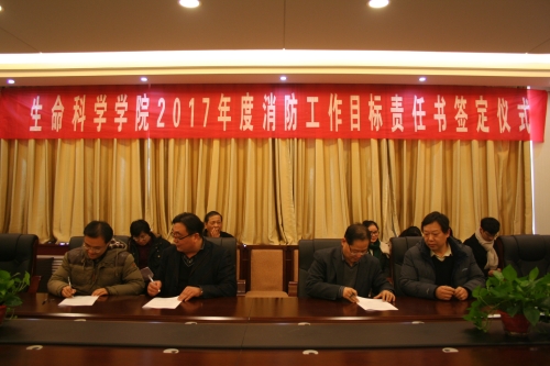 为加强学院消防安全工作管理,进一步健全“党政同责,一岗双责,齐抓共管”的消防安全管理体系,1月3日下午,生命科学学院在生物西楼二楼会议室举行2017年度消防安全责任书签订仪式。院党政领导马新峰、李春喜、陈勇、李卫国、李建军,全体教研室(科室)负责人、党支部书记、辅导员,以及导师代表、学生代表等出席仪式,签订仪式由副院长李建军主持。