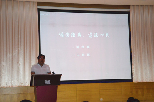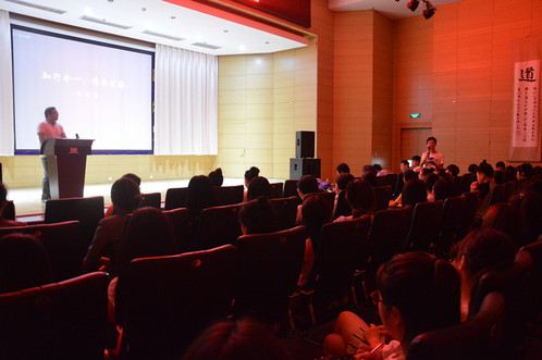 本次道德讲堂分诵经典、内自省、学模范、言感悟、宣誓言、做承诺六个环节进行。道德讲堂在脍炙人口的快板宣讲声中正式拉开帷幕。在诵经典环节中,广播站学生代表带领全体师生诵读《弟子规》和《道德经》中的两篇内容,让师生用心感悟国学经典的内涵,并通过自省环节叩问心灵、明辨是非、崇德向善。学模范环节中,在共同观看一对坚持行善33年的老夫妻的感人视频后,全国第11届人大代表、全国道德模范、全国劳动模范、全国拥军模范、全国三八红旗手、入选中国文明网“中国好人榜”的河南省新乡市糖业烟酒有限责任公司董事长、总经理买世蕊女士为大家进行了精彩的演讲。买女士结合自身经历表明快乐可以分享、爱可以叠加,并号召大家多做善事,从身边的一点一滴做起,在共筑中国梦的过程中实现自我价值。买女士感人至深的讲座,赢得了阵阵掌声。最后,全体师生将写有心得体会的便利贴粘到寄语展板上,共同印证德与善的传习。