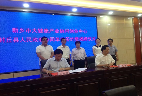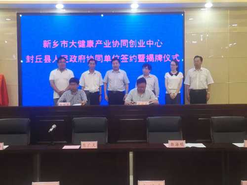 随后,副校长、中心理事长陈广文同志,封丘县人民政府副县长鹿顺庆同志共同签署“新乡市大健康产业科技协同创新创业中心合作协议书”。学院副院长李建军同志、封丘县金银花中药材产业发展领导小组办公室主任张伟同志共同签署“金银花良种良法配套技术推广及产业化协议书”。在大家的热烈掌声中,双方领导共同为新乡市大健康产业科技协同创新创业中心协同单位揭牌。