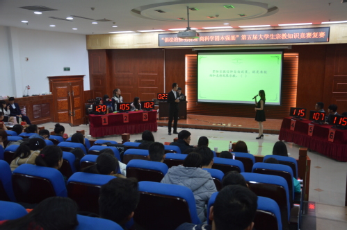 此次竞赛共63名选手,他们由各学院前期认真组织选拔并推荐产生,共分为11组进行该场比赛。大赛分为必答题“头脑风暴”环节、抢答题“谁与争锋”环节、风险题“涅槃重生”环节进行,竞赛题目涵盖了宗教知识、政策、法律、法规及马克思主义宗教观等的相关知识。“头脑风暴”环节需选手轮流回答三道必答题,答题过程中,选手们从容不迫,应答自如;“谁与争锋”环节中,每组共二十五道抢答题,选手们反应迅速,思维敏捷,充分展现其丰富的宗教知识积累、良好的心理素质和敏捷的思辨能力。经过激烈角逐,石朋朋、张忆楠、王一鸣等十二位选手脱颖而出,进入决赛。