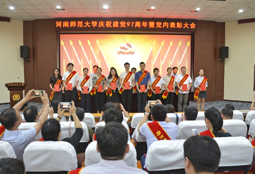 6月29日上午,在我校庆祝建党97周年暨党内表彰大会上,我院教工行政党支部和本科生2016级党支部获“先进基层党组织”,杨献光获“河南省优秀共产党员”,姜丽娜、李爱景、马剑敏、史晓晓、安东(学生)、白丽珍(学生)、段莹星(学生)、王晓芳(学生)、张哲(学生)获“校优秀共产党员”,陈建军、郭委获“校优秀党务工作者”。陈建军同志作为优秀党员和优秀党务工作者代表在表彰大会上发言。
