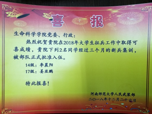 12月27日上午,校武装部向生命科学学院党委、行政送来喜报:热烈祝贺我院在2018年大学生征兵工作中取得可喜成绩。我院14级李晨阳和17级姜亚鹏两名同学经过三个月的新兵集训,被部队正式批准入伍。