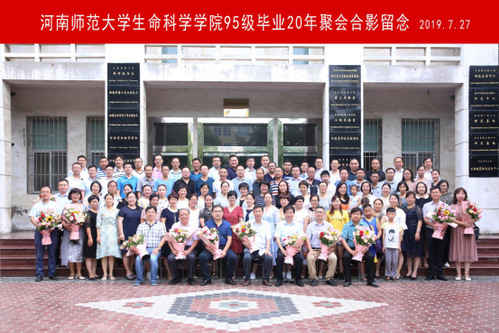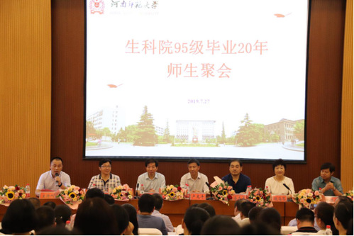 盛夏时节,炎炎酷暑,7月27日上午9:30,生命科学学院“增进友谊,共筑未来”95级校友毕业20年聚会在生物报告厅隆重举行。校党委常委、副校长、时任生科院95级辅导员岳杰勇,校党委常委、党委宣传部部长、时任生科院95级辅导员聂立清,校友工作办公室主任魏海琴,学院老院长、为95级校友讲授《遗传学》课程的任课教师卢龙斗,任课教师代表李明军、牛红星,学院领导丁笑生、余国营、陈勇、陈建军、杨献光以及从国内外赶到母校的近80名校友等见证聚会。会议由95级校友董新尚主持。