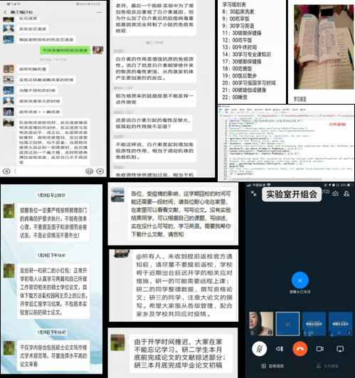 我院研究生课程学习以第一学年为主,2019级全体研究生在参加网络教学的同时,研究生导师积极做出响应,各实验室根据年级特点和科研实际情况,以不同形式指导研究生看文献、分析数据、学英语等,为返校后的实验研究做好准备。他们制定周密的学习计划,在线上学习的同时,与任课教师和导师沟通学习过程中遇到的问题,老师详细分析及时解决,克服距离问题,避免交流障碍,为本学期研究生的课程学习、实验准备和论文写作提供有力支撑。