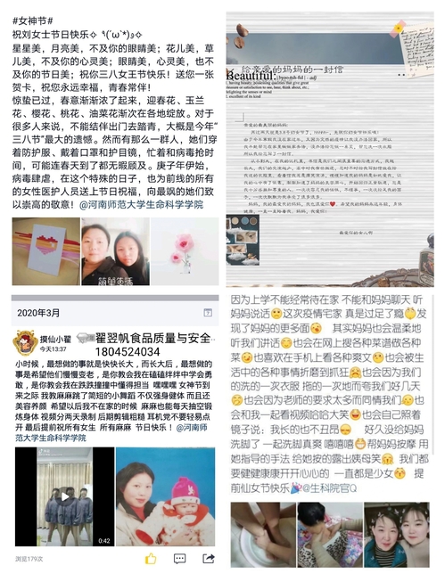 本次活动号召同学们通过帮妈妈做家务、为妈妈做按摩、为妈妈做美食、送妈妈一封信等多种方式,表达出对母亲的浓浓的爱意与诚挚的感谢。活动一经开展,就得到了我院学生们的热烈反响,学生们积极参与,纷纷晒出与母亲互动的照片或视频。其中,2018级生物科学专业罗霄风用笔触下的文字记录成长旅途中母亲给予孩子的关怀与呵护,句句饱含深情、字字凝结爱意。2018级食品质量与安全专业翟翌帆将对母亲的爱传递于一段舞蹈中,母女一起跳舞,共同拥抱健康与活力。2019级生物科学专业白怡洁想法新颖,为母亲送上亲手用纸条编织出的爱心贺卡,小小的卡片中蕴含着对母亲最真挚的祝福。每个人表达的方式都不同,但其中都凝聚着儿女对母亲浓浓的感恩之情,也彰显出母亲对儿女的情深厚爱。