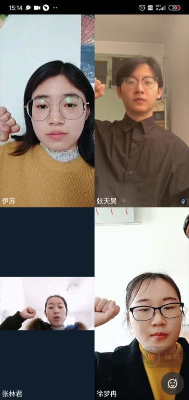 接着,在支部书记马翠的领誓下,支部全体党员重温入党誓词,大家虽然相隔千里,但铮铮誓言,拳拳初心,此起彼伏、慷慨激昂的宣誓之声通过网络传播,在学生党员的胸中涌动。宣誓结束后,大家共同观看了由支部成员共同制作的《抗击疫情党员力行》发声视频。视频中,支部成员采用诗歌朗诵接力形式为战斗在疫情防控第一线的工作人员送去祝福,并纷纷喊出“疫情在前,我向前”、“党员预备,行动不预备”、“同心战役,我先行”、“抗击疫情,党员力行,我们在行动”等承诺,将党日活动推向高潮。