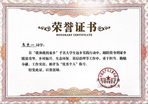 信中指出,在2020年7月至2021年3月期间,韦竞一积极响应共青团开封市委“我和我的家乡”千名大学生返乡实践行动的号召,踊跃投身家乡志愿服务建设。在脱贫攻坚、乡村振兴、生态环保、基层治理等工作中表现突出,被评为“优秀个人”称号,得到所在实践单位和服务群众的一致好评和称赞。韦竞一同学在工作中勇敢担当、任劳任怨、无私奉献,践行了习近平总书记“坚定理想信念、站稳人民立场,练就过硬本领、投身强国伟业”的殷殷嘱托,展现了青年大学生的良好形象和素质,树立了生科学子的文明形象,为家乡发展做出了积极贡献。