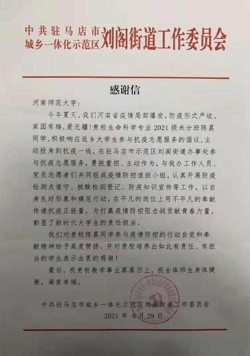 近日,生命科学学院收到驻马店市城乡一体化示范区刘阁街道工作委员会发来的感谢信,信中对2021级生物科学专业陈晨同学在疫情防控工作中的行动自觉与奉献精神高度赞扬;同时2021级生态学专业高玉桢同学在7.20特大洪灾抗洪志愿服务工作中受到尉氏县红十字会表扬,感谢她在服务中的无私奉献与突出表现。