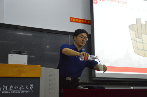 会上,丁笑生从学习青年寄语、践行七一精神、奉行两个理论、认识九个人物、树立一个目标、夯实学习成果六个方面进行讲解,并通过实验形象地阐释了“木桶理论”的“长板效应和短板效应”的深刻哲理,指导学生打好基础、补齐短板、认真学习科学文化知识。他勉励新同学要在未来的大学生活中拓宽课外知识、培养对科学和艺术的兴趣、激发学生学习热情、不断进步、学以成人,保持勇气和信心,保持良好的的心态,时刻准备抓住机会,传承好师大的家国情怀。