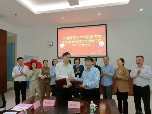 10月27日下午,我校和广东凯普生物科技股份有限公司(下称“凯普”)校企合作协议签约及揭牌仪式在广州举行,凯普集团副总经理、医检集团总经理、首席科学家谢龙旭、凯普学院院长马瑞君、校党委常委、副校长郭海明及科技处、生命科学学院相关负责人参加会议。