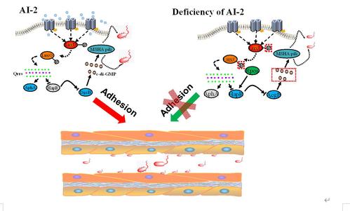 维氏气单胞菌(Aeromonas veronii),是一种常见的人畜共患病致病菌,对人类与各种水产养殖动物的健康造成了重大危害。此前的研究发现,黏附是维氏气单胞菌感染致病的关键步骤,但是关于维氏气单胞菌的黏附机制,仍不完全清楚。本研究发现了群体感应信号分子AI-2能够通过第二信使c-di-GMP来调控维氏气单胞菌MSHA-IV型菌毛基因表达及菌毛合成,进而影响其黏附的分子机制。该研究进一步加深了人们对病原菌致病机制的理解,并为开发病原菌新的防治策略提供了一定的理论依据。