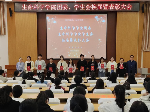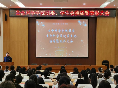 为激发学生干部的活力与创新力,树立优秀典范,4月12日中午,生命科学学院在生物报告厅举行2023-2024年度团委、学生会换届暨表彰大会。生命科学学院党委副书记朱进、生命科学学院团委副书记马静潇以及第72届、第73届团委、学生会全体成员参加本次大会。会议由马静潇主持。