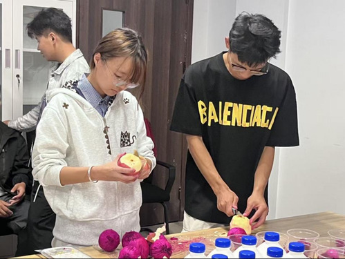 活动在亲切融洽的师生交流中拉开序幕。谭笑首先与学生深入沟通,细致询问留校期间生活起居、饮食安排及出行计划,并围绕假期安全注意事项、校园服务保障事宜开展针对性教育引导;随后,四十余名留校生依次进行自我介绍,同步分享个人假期学习计划与生活安排。在水果捞制作环节,学院提前筹备火龙果、哈密瓜、苹果、酸奶等丰富食材,学生在分工协作中充分发挥创意,巧妙搭配食材并摆出富有节日寓意的造型,现场欢声笑语不断;进入成果分享环节,师生围坐一堂,共同品尝亲手制作的水果捞,进一步交流假期规划与校园生活感悟,持续深化互动氛围。