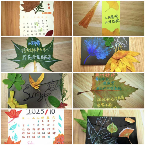 活动以秋为媒,以手作为桥,融合劳动实践、美学教育与心理关怀,设置了“日历绘秋”“书签藏秋”“晒秋成诗”“塞秋入信”四个环节。前序环节中,同学们围绕秋日主题,设计兼具实用与美感的专属日历,并以落叶为材创作个性化书签,在指尖实践中感知季节流转与物我相融。后续活动中,参与者于叶片上题写诗句,制成“秋韵叶诗”,将自然之物升华为情感寄托;在“塞秋”环节,同学们手写秋日寄语、装饰信封,将一季秋光凝于笔墨、封存留念。