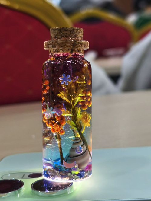 活动伊始,讲解员以通俗易懂的语言,对滴胶调配比例、植物素材处理和封装技巧等关键环节进行细致讲解,帮助同学们快速熟悉整体制作流程。大家有序围站在工作台前,精心挑选叶片、花瓣等本土植物素材,小心翼翼地将其与滴胶结合,专注地创作专属自己的漂流瓶。创作过程中,现场氛围热烈而融洽,大家沉浸在手工创作的乐趣中,主动交流各类植物的名称、生长习性等知识,围绕“资源再利用”“本土植物保护”等话题展开探讨。活动尾声,同学们互相展示自己的创作成果,灯光下,一个个晶莹剔透的漂流瓶熠熠生辉,瓶中封存的植物标本形态各异,承载着手工创作的巧思,凝聚着大家对大自然的珍视与守护之情。