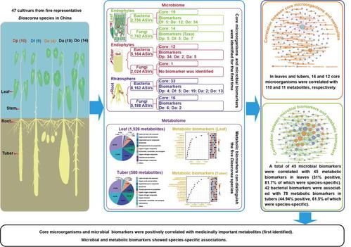 杨清香教授团队利用多组学联合分析,阐明我国5个种(47个栽培品种)的山药在叶片、块茎和根际代谢组/微生物组方面存在显著种间差异,揭示了特定核心微生物或生物标志物与种特异性的药用活性代谢物密切相关,强调了植物—微生物—代谢物互作在山药功能成分形成中的潜在调控作用,为药食同源山药的品质提升和微生物资源精准利用提供了新的理论依据和应用靶点。