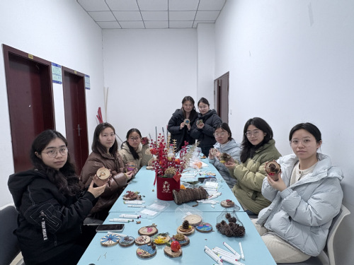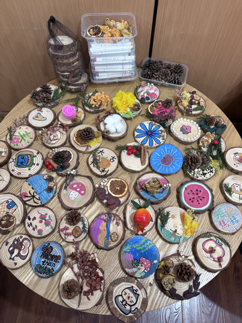 活动前期,学院通过线上平台精准发布通知,详细说明活动流程与材料准备,确保活动通知传达到位。活动开展期间同学们以天然木片为画布,用干花、松果、彩笔等材料,将对生命的理解与热爱凝于指尖,在动手实践中完成了一次生动的生命启蒙。在实践过程中,同学们携手合作,仔细打磨木片、精心搭配材料,从构思设计到细致创作,每一片木片都被赋予了独特的生命意义,成为承载学生情感与思考的艺术品。