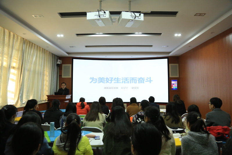 应社会事业学院邀请,11月23日上午,湖南省社会科学界联合会《湖南社会科学》主编、湖南省省情研究会副会长、湖南师范大学兼职硕士导师吴纪宁于社会事业学院办公楼503室作了题为“为美好生活而奋斗”的讲座。学院副院长张晨寒、劳动与社会保障专业系主任海龙以及部分骨干教师携学生五十余人共同聆听了此次讲座。