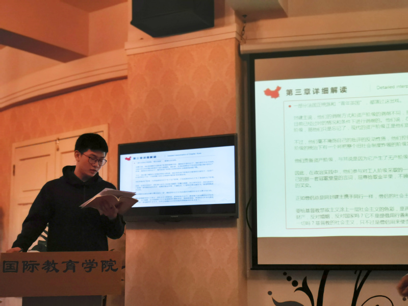 活动伊始,团委书记韩舒安排了本学期的学习任务,并对学习计划进行具体部署。接下来,2017级经济专业宋炬攀和2017级法语专业慕晨分别用中文和英文对《共产党宣言》第三章“社会主义和共产主义的文献”的相关内容进行了详细解析,我们应该坚持用历史的眼光看问题,做到具体情况具体分析,警惕历史虚无主义对我们的侵蚀和腐化。2017级法语专业郜翔以漫画PPT的形式分享了近期世界上一些大事情的见解,使同学们增强国际视野,树立大局意识,追梦登高开望眼。最后,2017级法语专业宋寒珂以思想交流的形式与同学们分享学习心得。