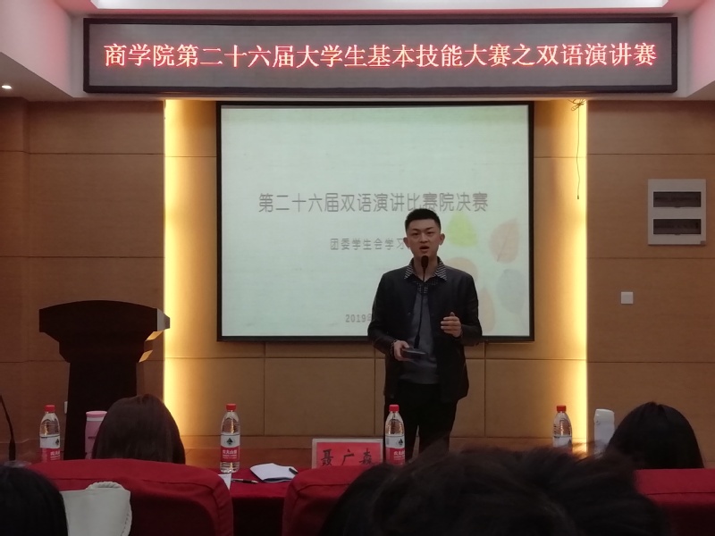 为贯彻习近平新时代中国特色社会主义思想和党的十九大精神,学习最新全国两会精神,我校拟举办第二十六届大学生基本技能大赛。商学院积极响应学校号召,精心筹备活动、严格选拔选手,于4月4日上午,举办双语演讲赛院级决赛。商学院2018级辅导员聂广森受邀参加此次比赛,学院各年级学生积极参与。