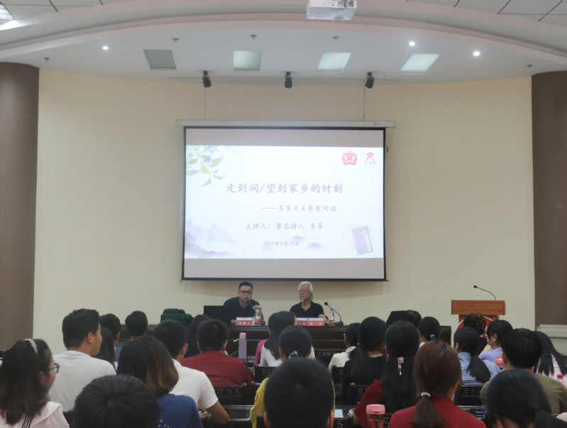 9月25日,应文学院邀请,海南大学教授、“朦胧诗”派代表性诗人之一多多在崇文楼一楼报告厅作了题为《诗歌的创造力》的学术讲座。学院相关老师及部分同学到场聆听讲座,本次讲座以对谈形式展开。
