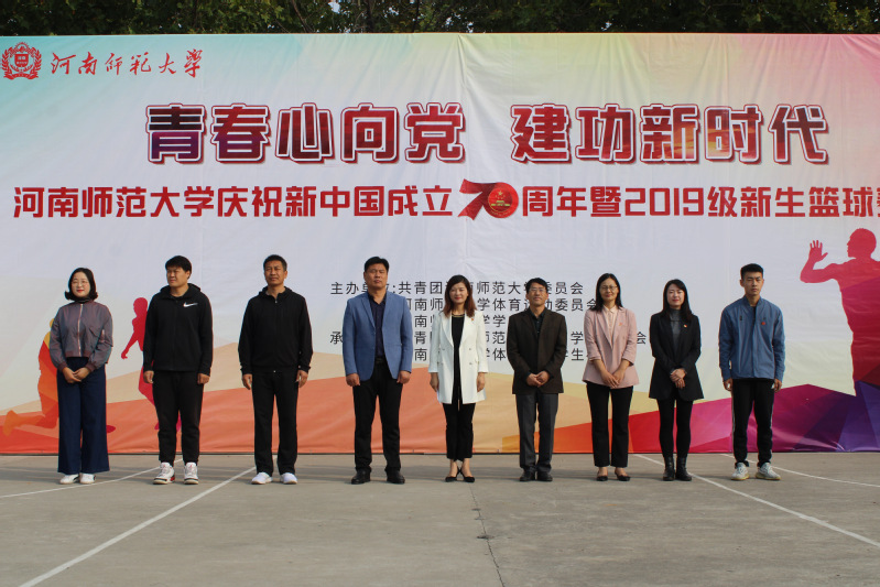 为积极响应全民健身、全民健康号召,扎实推进“健康中国”战略。10月13日上午9时,由我校团委、学生会主办,体育学院团委、学生会承办的2019级新生篮球赛开幕式在西区水泥篮球场举行。校团委书记孙冬青,校体委副主任王健,体育学院党委书记岳贤锋,各学院团委书记等领导老师出席开幕式,本次比赛裁判员、各学院参赛队300余人参加开幕式。开幕式由体育学院团委书记董文可主持。