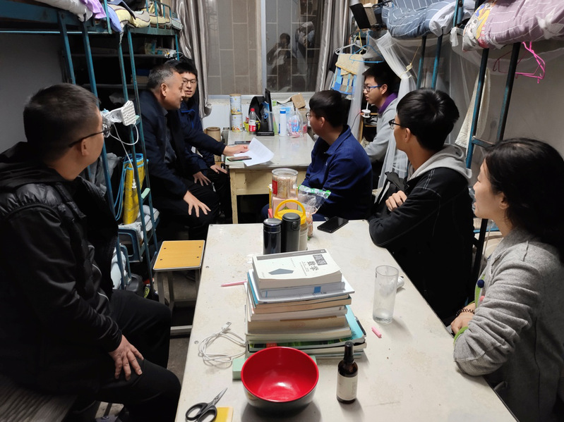 物理学院领导班子召开专题会议,会议中物理学院党委书记李清富指出,班子成员和科级干部要带头深入基层,抓落实抓实效,切实让学生得到益处;院长杨宗献强调,要全面覆盖所有宿舍,尤其是留级、转专业的学生要多留心,不能让一个学生掉队,更要结合专业特点,合理分派导师。会后,物理学院结合学院特点,依托物理学院成长导师制,根据教师专业基础和学生的专业特点,在原有工作基础上深入开展宿舍导师活动。截止到上周,物理学院四个年级的所有宿舍均配备了宿舍导师,做到了百分之百的覆盖率。11月5日起,宿舍导师陆续深入学生宿舍,了解学生实际情况,引导学生坚守意识形态阵地和报国初心,坚定理想信念。11月12日,学院党委副书记陈明银来到自己所带的宿舍,鼓励学生团结友爱、互助共进、要把寝室真正的看作自己的家,一起努力将寝室打造成标兵寝室、模范寝室。