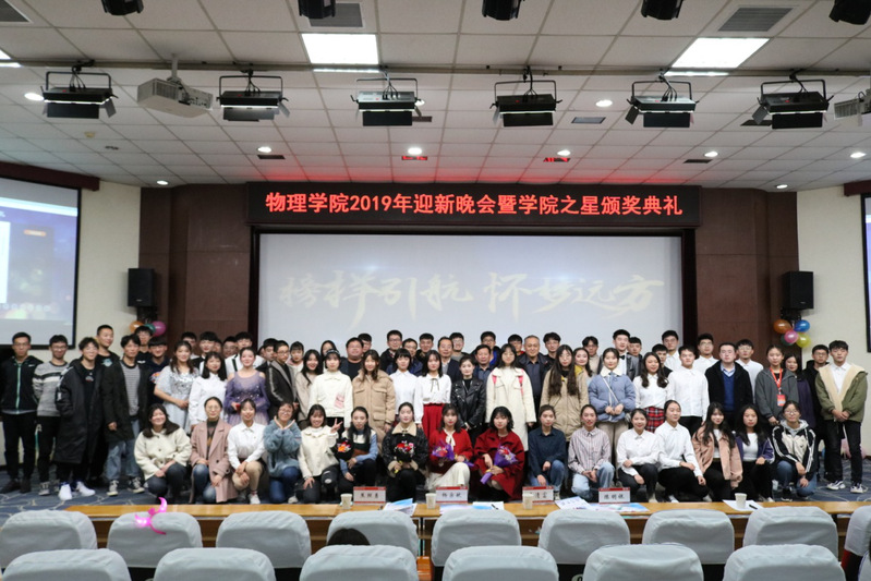 11月18日晚,物理学院于物理北楼报告厅举行“榜样引航,梦怀远方”学院之星颁奖典礼暨2019级迎新晚会。物理学院党委书记李清富、院长杨宗献、党副书记陈明银、副院长焦照勇,2019级新生辅导员张浩兴,教师代表、各学院学生会主席及2019级全体新生等近400人观看了本次晚会。