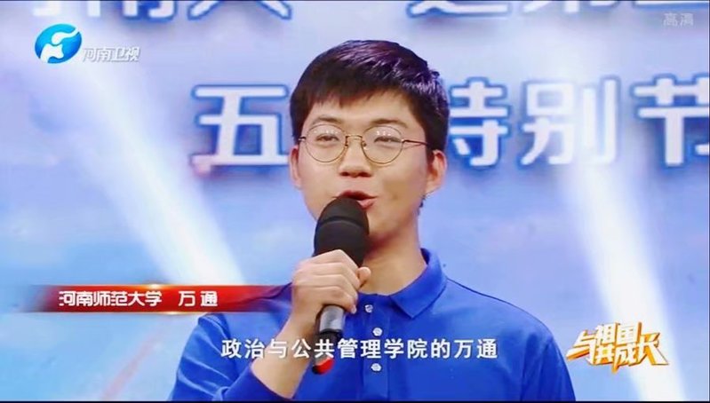 5月4日晚,由中共河南省委宣传部、中共河南省委高校工委、河南省教育厅主办,河南广播电视台卫星频道、河南教育报刊社教育时报承办的“出彩河南人”最美大学生五四特别节目——《与祖国共成长》于河南卫视播出。“青春众志•教育守护成长”在线助学团队发起人之一,政治与公共管理学院2017级思想政治教育专业学生万通应邀参加节目。