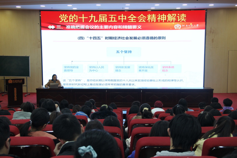 马二杰深入聚焦党的十九届五中全会精神,围绕“深刻认识十九届五中全会的重大意义”“全面了解会议的主要成果和起草情况”“准确把握会议的核心内容和精髓要义”和“当代青年学生的历史使命和责任担当”四个主题,用通俗易懂的语言向在场师生讲解了十九届五中全会的相关内容及要义。讲解过程中,她通过播放短视频向同学们呈现了我国经济社会发展取得的成就,并用幽默风趣又发人深省的语言鼓励同学们要善于抓住机遇、应对挑战、肩负使命,为实现中华民族伟大复兴的中国梦不懈奋斗。