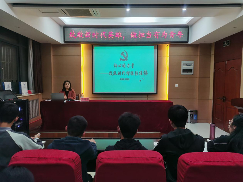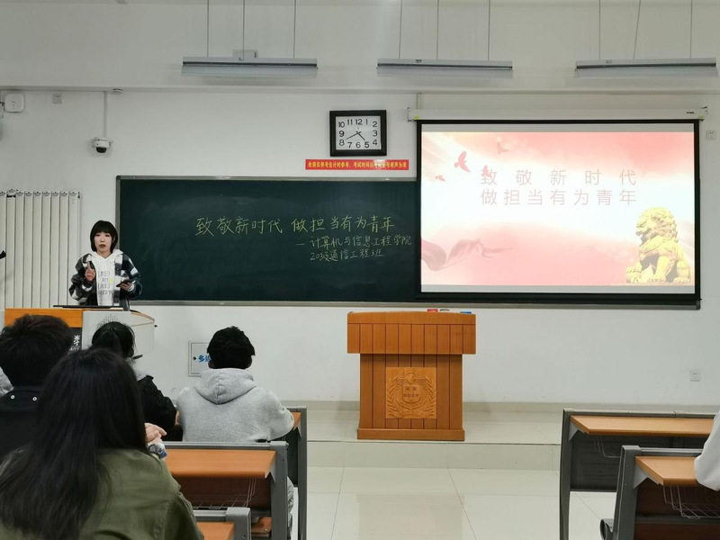 3月24日下午,计算机与信息工程学院于文昌楼107开展“致敬新时代英雄·做担当有为青年”主题班会。党支部书记、2019级辅导员高若婷和2019级计算机与信息工程学院全体学生参加此次班会。班会由高若婷主持。