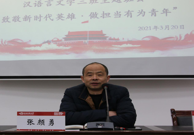 3月19日至24日文学院各个年级陆续举行“致敬新时代英雄·做担当有为青年”主题班会。文学院党委副书记张颜勇老师、四个年级辅导员老师及各班班主任与会指导。