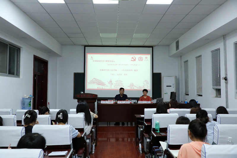 6月19日晚,文学院院长赵黎波在崇文楼506室为学院师生作题为“改革时代的人生交响——《平凡的世界》解读”的讲座。该讲座为“悦读红色经典 培育时代新人”系列讲座的第三场,是文学院党史学习教育的重要组成部分。本次讲座由文学院张翼教授主持,文学院文学党支部书记周惠担任评议人,近百名学生积极参与学习。