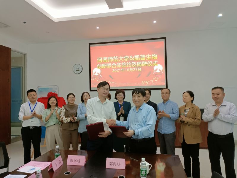 我校生命科学学院91级校友,凯普集团副总经理、医检集团总经理、首席科学家谢龙旭代表公司致欢迎辞。凯普学院院长马瑞君介绍了与我校在凯普创新人才实验班、联合培养研究生,共建生物医药研发中心等方面的合作意向与合作方式。最后,双方签署组建创新联合体框架协议及河南师范大学专业实习基地建设协议书并进行揭牌仪式。