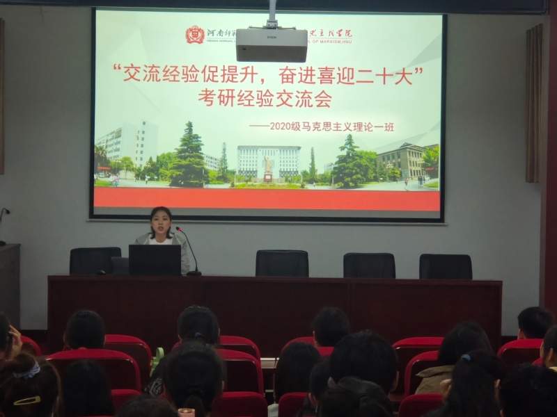 为增强班级学风建设,营造互相学习、追求真知的学习氛围,提升同学们对考研信息的了解度,敦促班级成员以更优异的成绩迎接党的二十大胜利召开,5月2日上午,马克思主义学院2020级马克主义理论一班于平原楼108开展以“交流经验促提升,奋进喜迎二十大”为主题的考研经验交流会,4位2018级优秀考研学生及班级全体成员参加活动。