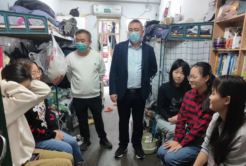 走访中,朱国超认真了解了同学们的学习生活情况,叮嘱同学们一定要做好个人防护,共同营造安全和谐有序的宿舍环境和校园环境。同时也对同学们提出了几点希望和要求:一是要清晰认识到当下疫情的严峻形势,全体师生要积极配合疫情防控工作,共克时艰;二是要坚持把重心放在学习上,即使线上教学也要保持学习激情,确保疫情防控期间课程教学不停教、网络教育不间断、思政教育不断线;三是有任何问题和需要及时进行反馈,学院会积极采取解决措施,第一时间为同学们排忧解难。副院长陈建军嘱托学生既要踏实求学,学得真本领,更要心系家国,立志投身祖国建设,做大格局、有情怀、敢担当的时代新人。同学们表示一定会严格遵守学校的防疫要求和管理规定,以优异的成绩和良好风貌为学校学院增光添彩。
