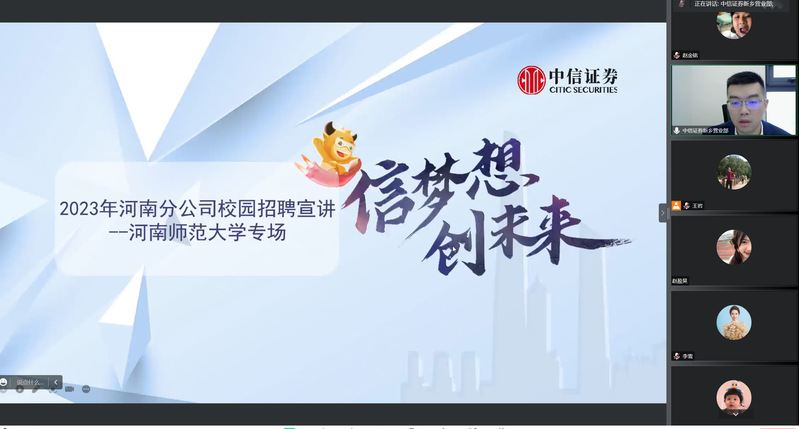 为促进毕业生高质量就业,搭建用人单位和求职者之间沟通的网络桥梁,10月28日下午,河南师范大学商学院举办第五期校园直播带岗活动。本次直播特邀中信证券公司进行线上宣讲招聘。会议由商学院教师王岩主持。